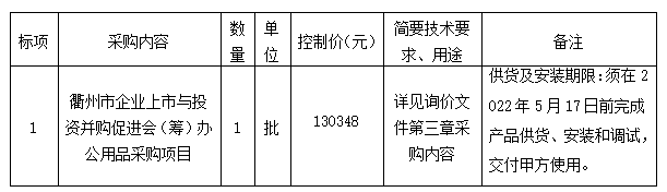 參照《衢州市國資委關(guān)于印發(fā)<衢州市國有企業(yè)采購管理辦法(試行)>的通知》(衢國資發(fā)[2020]36號)、《中華人民共和國政府采購法》、《政府采購貨物和服務(wù)招標(biāo)投標(biāo)管理辦法》等規(guī)定,衢州市智信工程咨詢有限公司受衢州市智慧置業(yè)有限公司的委托,就衢州市企業(yè)上市與投資并購促進會(籌)辦公用品采購項目進行詢價,本項目為非依法必招項目,現(xiàn)請合格供應(yīng)商參加投標(biāo)。