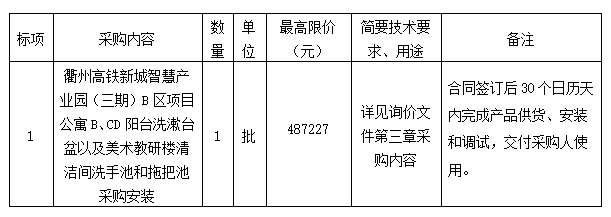 參照《中華人民共和國(guó)政府采購(gòu)法》、《政府采購(gòu)貨物和服務(wù)招標(biāo)投標(biāo)管理辦法》等規(guī)定,浙江求是工程咨詢(xún)監(jiān)理有限公司受衢州市智慧產(chǎn)業(yè)投資發(fā)展有限公司的委托,就衢州高鐵新城智慧產(chǎn)業(yè)園(三期)B區(qū)項(xiàng)目公寓B、CD陽(yáng)臺(tái)洗漱臺(tái)盆以及美術(shù)教研樓清潔間洗手池和拖把池采購(gòu)安裝項(xiàng)目進(jìn)行詢(xún)價(jià),本項(xiàng)目為非依法必招項(xiàng)目,現(xiàn)請(qǐng)合格供應(yīng)商參加投標(biāo)。