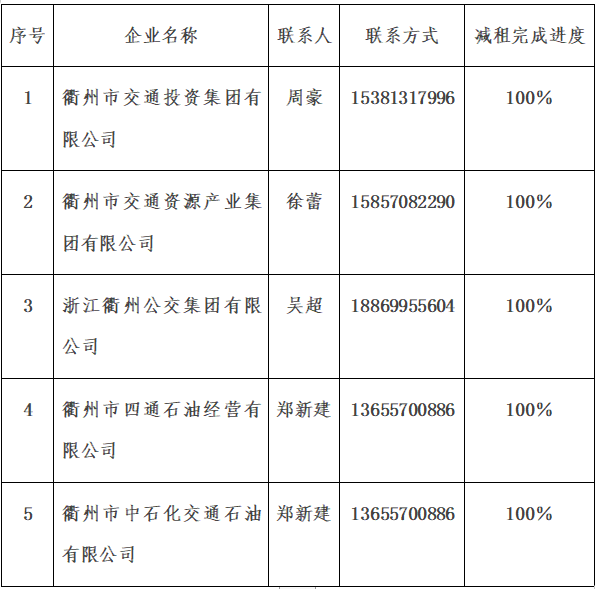 截至5月31日,衢州市交通投資集團(tuán)有限公司應(yīng)減租金332.51萬元,涉及承租戶14戶;已減租金332.51萬元,占應(yīng)減租金的100%,已減租14戶,占應(yīng)減承租戶的100%;其中,小微企業(yè)應(yīng)減房租254.02萬元,涉及承租戶4戶,已減租金254.02萬元,已減租4戶;個體工商戶應(yīng)減房租78.49萬元,涉及承租戶10戶,已減租金78.49萬元,已減租10戶。感謝您對國有企業(yè)減租工作的理解和支持。
