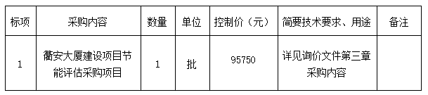 參照《衢州市國資委關(guān)于印發(fā)<衢州市國有企業(yè)采購管理辦法(試行)>的通知》(衢國資發(fā)[2020]36號)、《中華人民共和國政府采購法》、《政府采購貨物和服務(wù)招標(biāo)投標(biāo)管理辦法》等規(guī)定,衢州市智信工程咨詢有限公司受衢州市信安產(chǎn)業(yè)投資集團有限公司、浙江衢交建設(shè)工程有限公司的委托,就衢安大廈建設(shè)項目節(jié)能評估采購項目進行詢價,本項目為非依法必招項目,現(xiàn)請合格供應(yīng)商參加投標(biāo)。