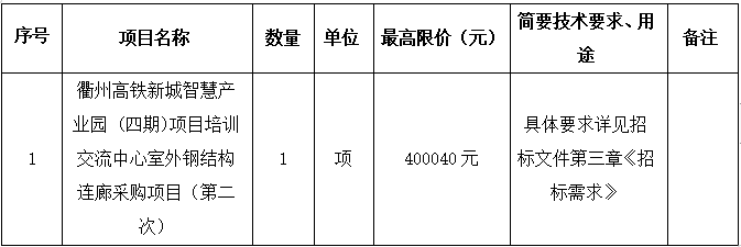 項(xiàng)目名稱(chēng):衢州高鐵新城智慧產(chǎn)業(yè)園 (四期)項(xiàng)目培訓(xùn)交流中心室外鋼結(jié)構(gòu)連廊采購(gòu)項(xiàng)目(第二次)