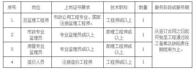 根據(jù)本項目特點,招標人提出以下監(jiān)理人員要求,投標人應根據(jù)本條要求配置監(jiān)理人員,并計算相應的投標報價。