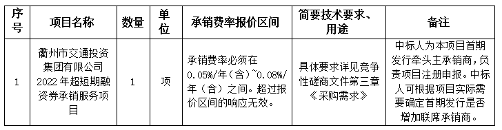 項(xiàng)目內(nèi)容及規(guī)模:衢州市交通投資集團(tuán)有限公司擬申報(bào)超短期融資券40億元人民幣,發(fā)行期限不超過270天(采取分期發(fā)行,發(fā)行金額以采購人實(shí)際需求為準(zhǔn)),采用余額包銷的方式承銷。