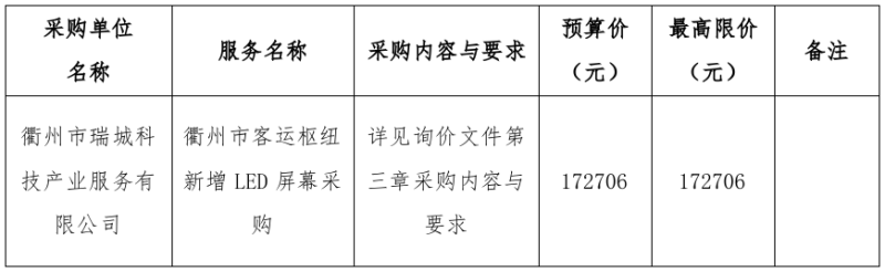 根據(jù)《衢州市國(guó)有企業(yè)采購(gòu)管理辦法(試行)》規(guī)定并參照《中華人民共和國(guó)招標(biāo)投標(biāo)法》、《中華人民共和國(guó)政府采購(gòu)法》等有關(guān)規(guī)定,衢州市兩山工程咨詢管理有限公司受衢州市瑞城科技產(chǎn)業(yè)服務(wù)有限公司的委托,對(duì)衢州市客運(yùn)樞紐新增LED屏幕進(jìn)行詢價(jià)采購(gòu),歡迎準(zhǔn)時(shí)參加。