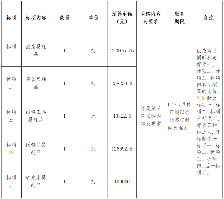 注:本項目的詢價文件須分標項一、二、三、四、五分別制作。