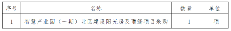 一、采購(gòu)項(xiàng)目名稱(chēng):智慧產(chǎn)業(yè)園(一期)北區(qū)建設(shè)陽(yáng)光房及雨篷項(xiàng)目