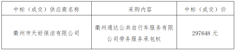 三、標項名稱:衢州通達公共自行車服務有限公司勞務服務承包權項目