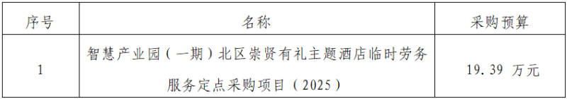 一、采購項目名稱:智慧產業(yè)園(一期)北區(qū)崇賢·有禮主題酒店臨時勞務服務定點采購。