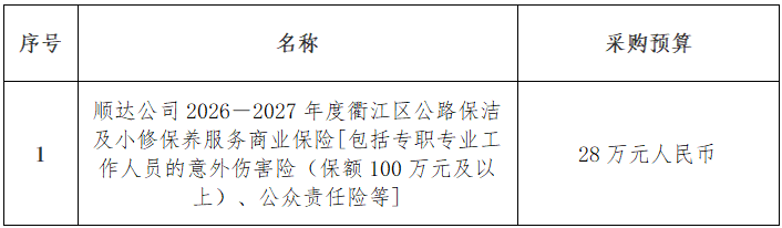 一、項目名稱:順達(dá)公司2026-2027年度衢江區(qū)公路保潔及小修保養(yǎng)服務(wù)商業(yè)保險