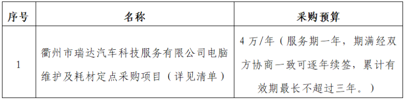 一、項目名稱:衢州市瑞達汽車科技服務有限公司電腦維護及耗材定點采購項目