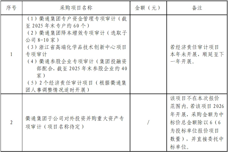 一、項(xiàng)目名稱:衢州衢通控股集團(tuán)有限公司2026年度內(nèi)部審計(jì)服務(wù)項(xiàng)目
