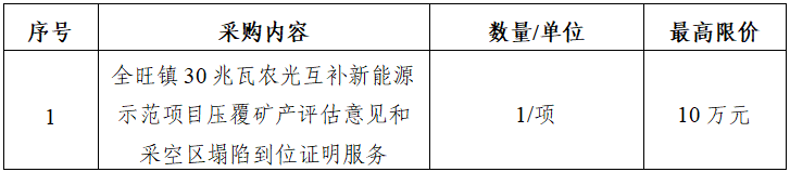 二、項(xiàng)目名稱:全旺鎮(zhèn)30兆瓦農(nóng)光互補(bǔ)新能源示范項(xiàng)目壓覆礦產(chǎn)評(píng)估意見(jiàn)和采空區(qū)塌陷到位證明服務(wù)