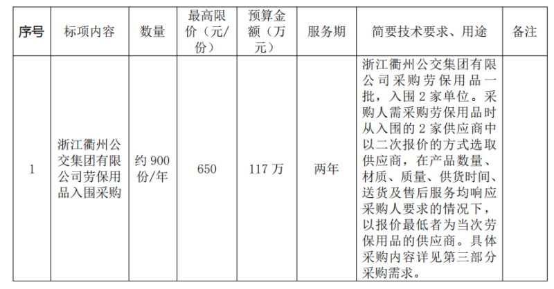 二、項(xiàng)目名稱:浙江衢州公交集團(tuán)有限公司勞保用品入圍采購項(xiàng)目