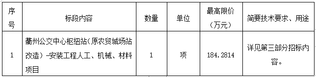 二、項(xiàng)目名稱:衢州公交中心樞紐站(原農(nóng)貿(mào)城場(chǎng)站改造)-安裝工程人工、機(jī)械、材料項(xiàng)目