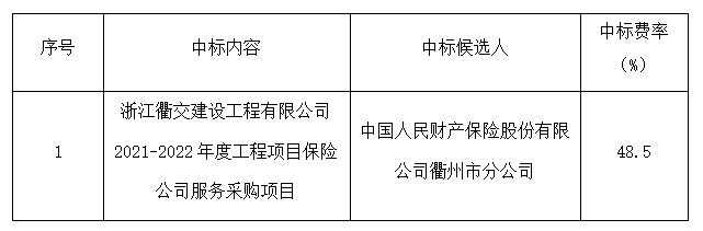 根據(jù)《中華人民共和國招標投標法》等有關法律法規(guī)的規(guī)定,浙江建安工程管理有限公司受浙江衢交建設工程有限公司委托,對其浙江衢交建設工程有限公司2021-2022年度工程項目保險公司服務采購項目采用公開招標方式進行招標。浙江建安工程管理有限公司于2021年08月17日09時30分在衢州市交通投資集團二樓開標廳(衢州市柯城區(qū)白云街道花園中大道86號)進行開評標。評標結果及相關事宜現(xiàn)公示如下: