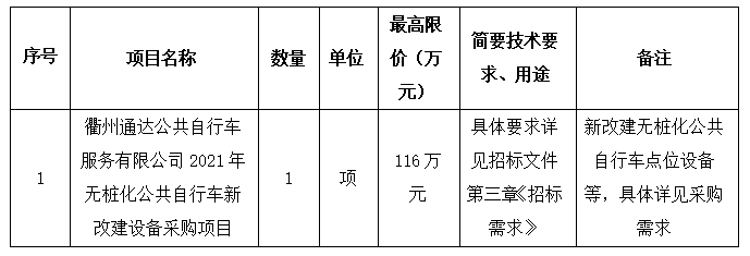 項(xiàng)目名稱:衢州通達(dá)公共自行車服務(wù)有限公司2021年無(wú)樁化公共自行車新改建設(shè)備采購(gòu)項(xiàng)目