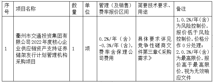 項(xiàng)目?jī)?nèi)容及規(guī)模:衢州市交通投資集團(tuán)有限公司計(jì)劃2022年度于上海(或深圳)證券交易所申報(bào)核心企業(yè)供應(yīng)鏈資產(chǎn)支持證券儲(chǔ)架發(fā)行項(xiàng)目,儲(chǔ)架規(guī)模不超過50億元,擬通過競(jìng)爭(zhēng)性磋商方式確定一家計(jì)劃管理機(jī)構(gòu),為采購人提供本項(xiàng)目申報(bào)發(fā)行及計(jì)劃管理等相關(guān)事項(xiàng),具體要求詳見采購內(nèi)容。