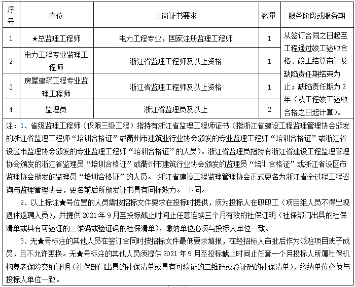 要求具備有效的國家注冊監(jiān)理工程師證書,注冊專業(yè)為電力工程。國家注冊監(jiān)理工程師:衢州市區(qū)(含市本級、柯城區(qū)、衢江區(qū)、智慧新城、智造新城,余同)外不得有在建工程的監(jiān)理業(yè)務(wù)(含已中標工程或為第一中標候選人的監(jiān)理業(yè)務(wù),余同),衢州市區(qū)不得有三個在建工程的監(jiān)理業(yè)務(wù);