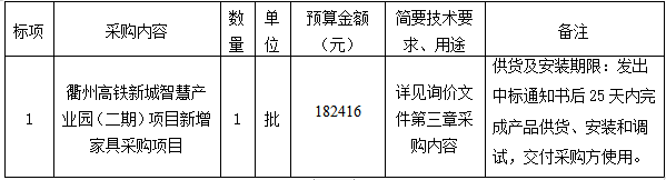 參照《中華人民共和國政府采購法》、《政府采購貨物和服務(wù)招標(biāo)投標(biāo)管理辦法》等規(guī)定,衢州市智信工程咨詢有限公司受衢州市智慧產(chǎn)業(yè)投資發(fā)展有限公司的委托,就衢州高鐵新城智慧產(chǎn)業(yè)園(二期)項目新增家具采購項目進行詢價,本項目為非依法必招項目,現(xiàn)請合格供應(yīng)商參加投標(biāo)。
