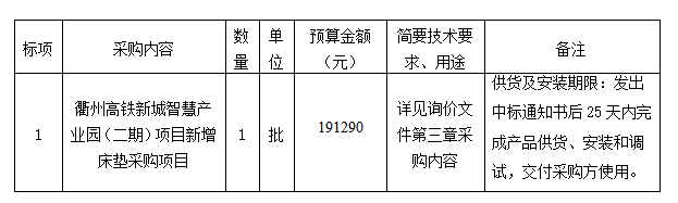 參照《中華人民共和國(guó)政府采購(gòu)法》、《政府采購(gòu)貨物和服務(wù)招標(biāo)投標(biāo)管理辦法》等規(guī)定,衢州市智信工程咨詢(xún)有限公司受衢州市智慧產(chǎn)業(yè)投資發(fā)展有限公司的委托,就衢州高鐵新城智慧產(chǎn)業(yè)園(二期)項(xiàng)目新增床墊采購(gòu)項(xiàng)目進(jìn)行詢(xún)價(jià),本項(xiàng)目為非依法必招項(xiàng)目,現(xiàn)請(qǐng)合格供應(yīng)商參加投標(biāo)。